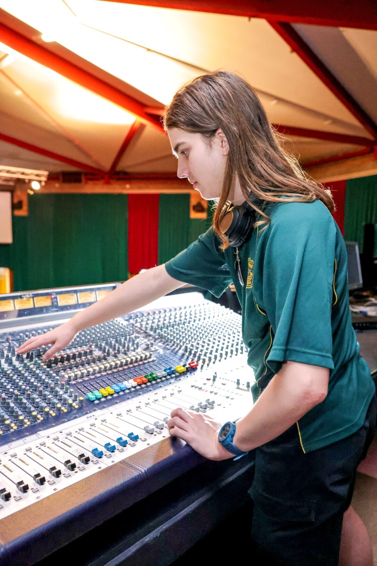 Operating the sound desk for an upcoming show.